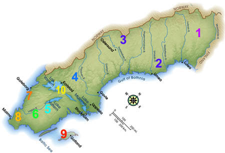 Om vi börjar längst i norr uppe i Norrbotten med "Sjö 1"där betingelserna är optimala. Det är långt norrut och långt till öppet hav.