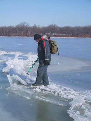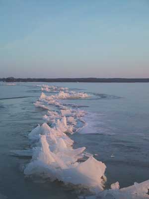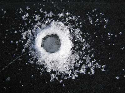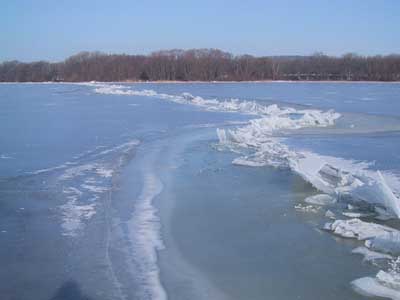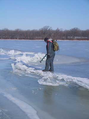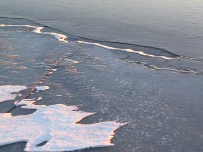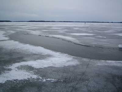 Här fortsätter bildgalleriet. Gammal råk som återfrusits av kärnis men ändå kan isen vara tunn och kanske ej bär så bra här. Ett större område som öppnat sig men återfrusit och isen kan vara förrädiskt tunn på denna typ av ställe. Immeln 2003. En klassisk råk som denna på Vombsjön går ofta över hela sjön. Råkarna styrs av djupskillnader under vattnet. Råken uppkommer när ismassorna utvidgar sig och drar ihop sig särskilt på senvintern då kontrasterna mellan dag och nattemperaturer är stora. Man skiljer på lyft och sjunkråkar. Detta är en lyftråk där iskanterna böjts uppåt. Sjunkråkens kanter är böjda nedåt och anses som mycket farligare men är oftast mer sällsynt än lyftråken. En råkpassage är ett kritiskt moment och går man på fel ställe kan plurrning vara ett faktum. Vid mildväder som varar länge bryts isen ned. Sprickor och hål vidgas och detta var ett pimpelhål som nu antagit denna groteska form. Isen börjar nu märkbart bli farlig vid denna tidpunkt att vistas på som fotot togs och kommer gå upp helt om kylan ej snart återvänder. "Rutten is" på vårkanten påminner förrädiskt om den svarta kärnisen men skenet bedrar. Ett "porlande" ljud i isen som nu har omvandlats till spröd stavis är ett stort varningstecken. Den starka solen smälter isen på dagen men om nätterna är kalla kan den bära på tidig morgon. Notera den uppborrade issörjan som ser ut som krossat "bilglas"... Kommer man nära så ser man "iskuberna" som bildats och notera borrhålets ojämna kanter. Denna is är lätt att borra i. Det är nästan som att "borra i smör" och isen är mycket svag och kan brista när som helst och markerar slutet på pimpelsäsongen. Stavis består av delvis smälta iskristaller som bildar "rör och stavar" tvärs genom isen och dessa kan skjuvas loss vid minsta belastning Likt "krossat bilglas" eller ett dricksglas av märket "Duralex" varnas för faran med stavis. Tyvärr så infaller det bästa fisket från isen just innan den går upp för säsongen. En närbild på en iskub av stavisen (som du aldrig ska beträda). Här skedde undersökningen av isen under kontrollerad form. Samtliga bilder av stavisen togs på Rössjön i slutet av mars 2005. Hoppas att du förundrats och tagit lärdom av bilderna. Webmaster februari 2006. |